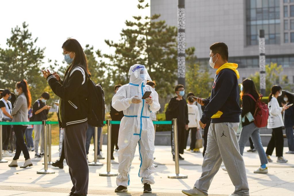 10月2日,在吉林省長春市一處便民核酸檢測點,工作人員為前來進行核酸檢測的市民掃碼登記。新華社記者 許暢 攝