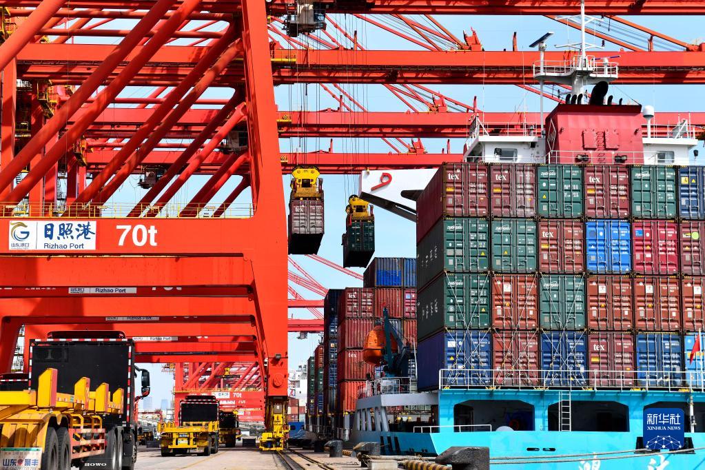 卡車在山東日照港集裝箱碼頭裝運集裝箱(3月28日攝)。新華社記者 郭緒雷 攝