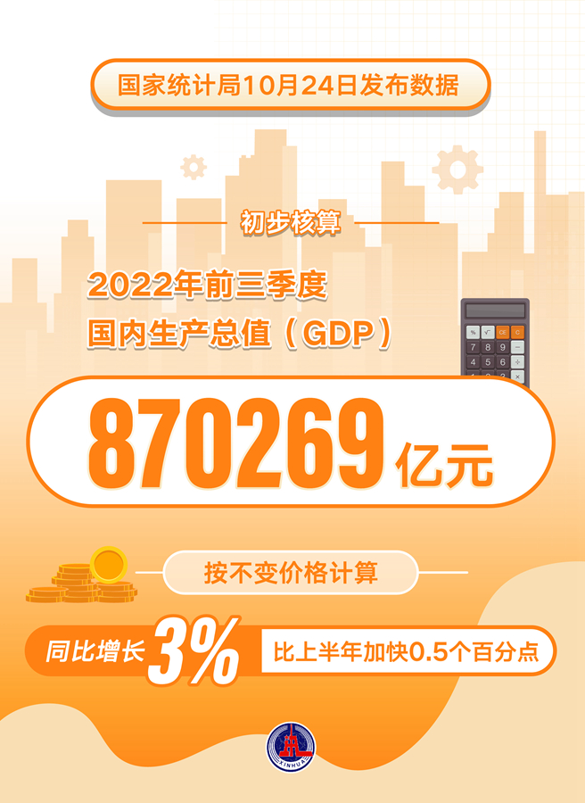 新華社北京10月24日電(記者魏玉坤、嚴賦憬)國家統計局24日發布數據,初步核算,前三季度國內生產總值(GDP)870269億元,按不變價格計算,同比增長3%,比上半年加快0.5個百分點。
